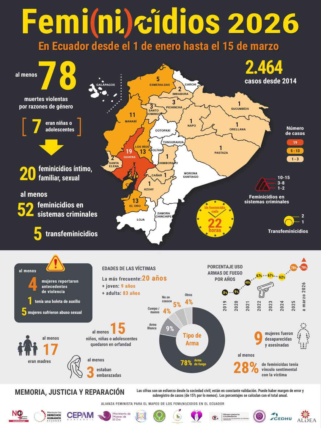 Al menos 15 niñas, niños y adolescentes han quedado en orfandad por los femicidios. El 78% de los femi(ni)cidios son cometidos con armas de fuego. La ola criminal es también una ola femicida, y el Estado no responde.